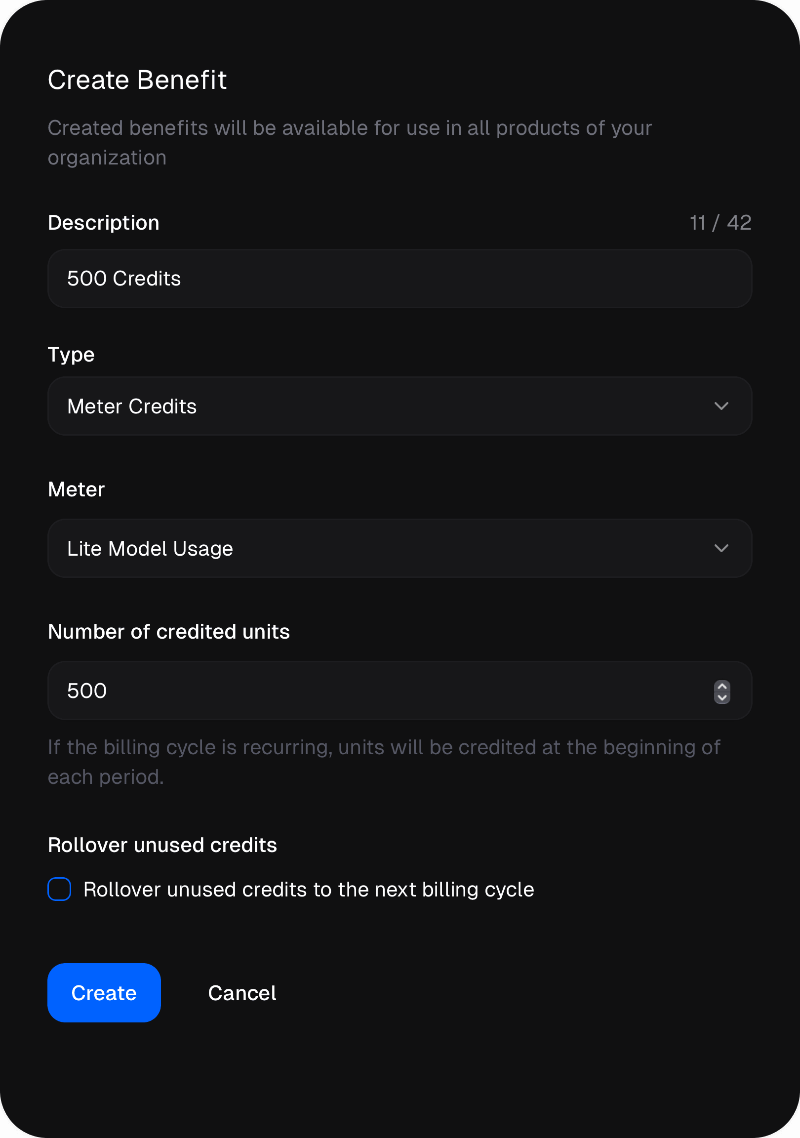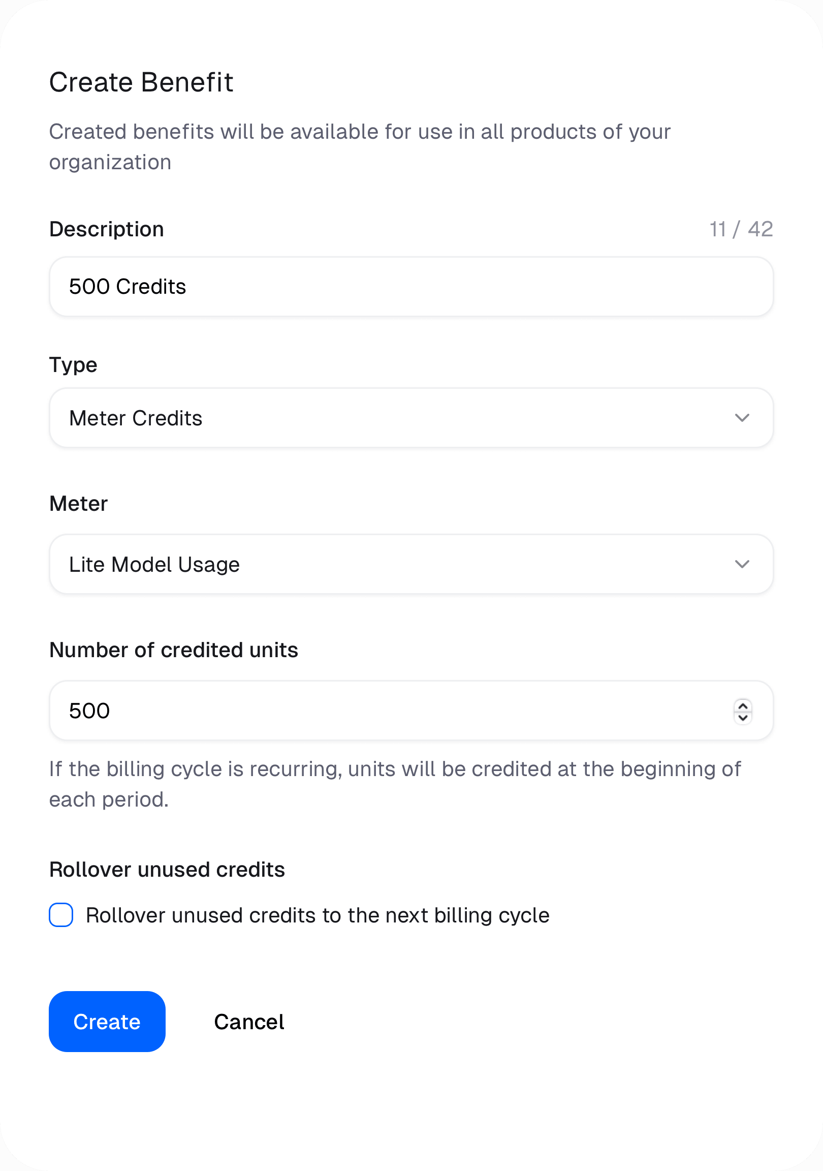 You can choose to rollover unused credits to the next billing cycle. This means that if a customer doesn’t use all of their credits in a given billing cycle, the remaining credits will be added to their balance for the next billing cycle. To enable this feature, check the “Rollover unused credits” checkbox when creating or editing the Credits benefit.If you change the rollover setting for a benefit, it will only apply to new
