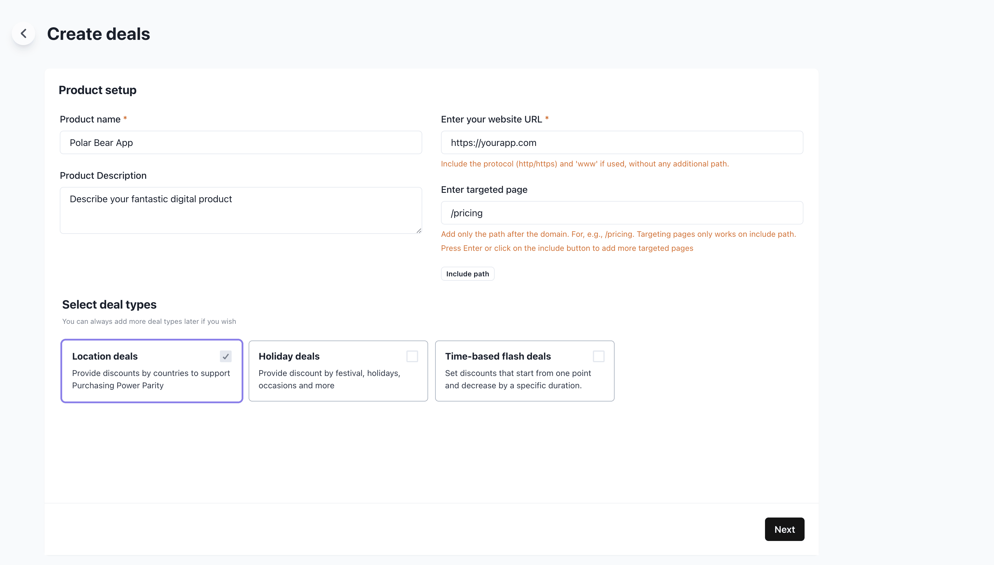 Let’s configure our deal settings.- Enter your website URL (requires your own site vs. Mersan storefront)